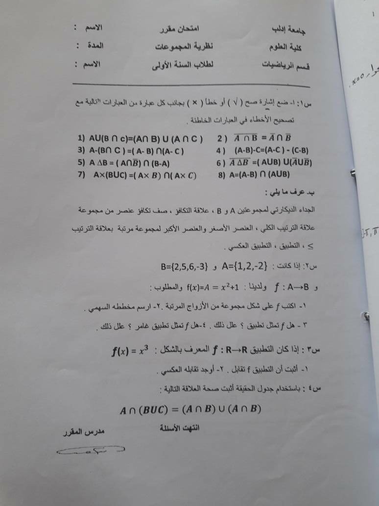اسئلة اختبار في مادة نظرية المجموعات للسنة1 جامعة ادلب كلية العلوم قسم رياضيات