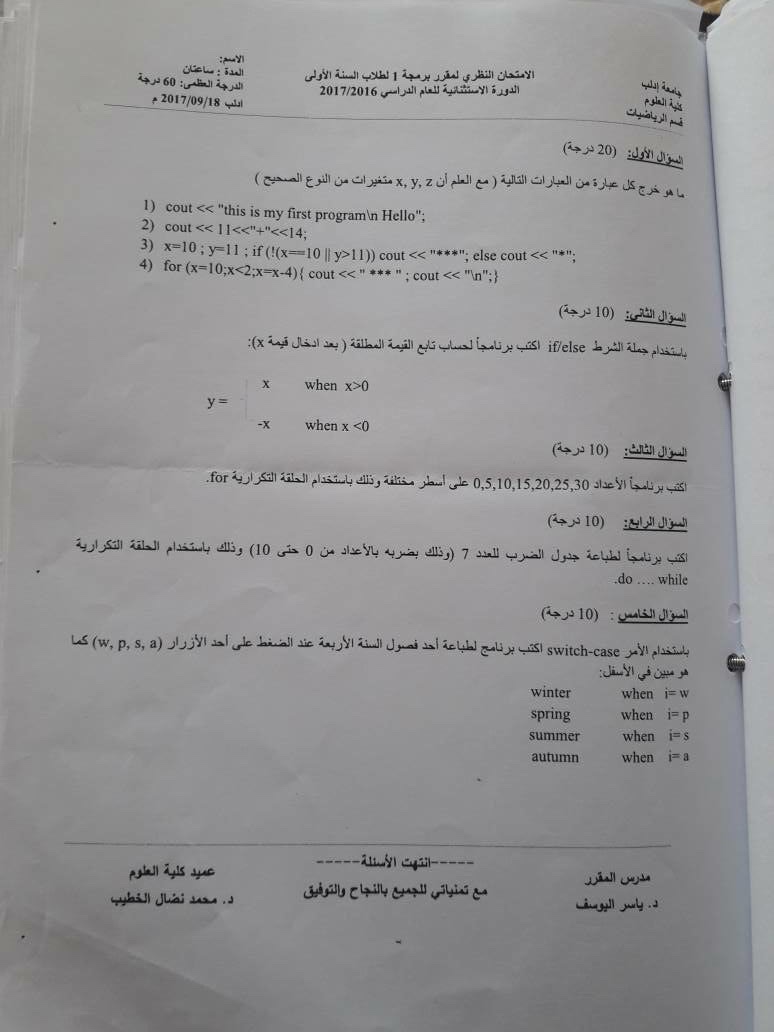 اسئلة اختبار في مادة البرمجة1 للسنة1 فصل3 عام2016-2017 جامعة ادلب كلية العلوم قسم رياضيات