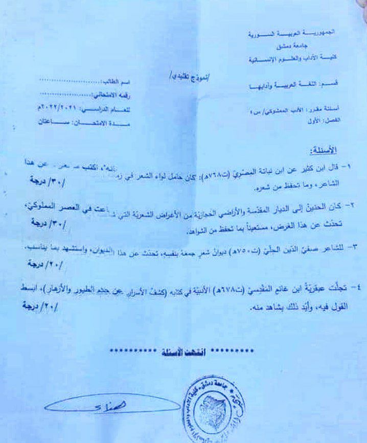 اسئلة اختبارات في مادة الادب المملوكي للسنة4 فصل1 عام2021-2022 جامعة دمشق كلية الاداب قسم لغة عربية