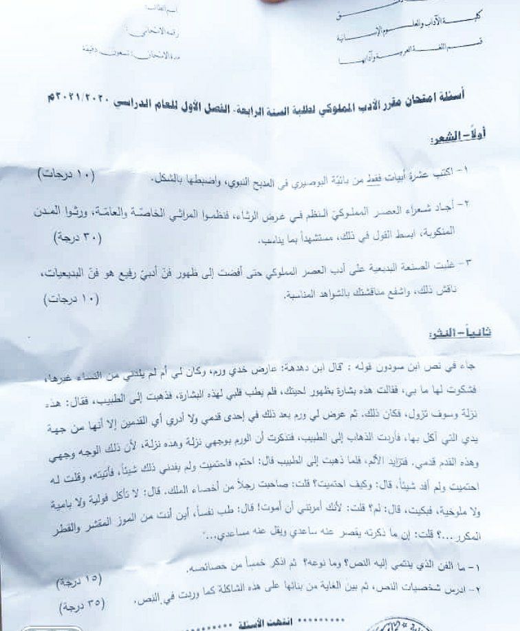 اسئلة اختبارات في مادة الادب المملوكي للسنة4 فصل1 عام2021-2020 جامعة دمشق كلية الاداب قسم لغة عربية