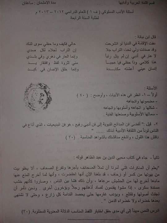 اسئلة اختبار في مادة الادب المملوكي للسنة4 فصل1 عام2013-2012 (نموذج2)جامعة دمشق كلية الاداب قسم لغة عربية