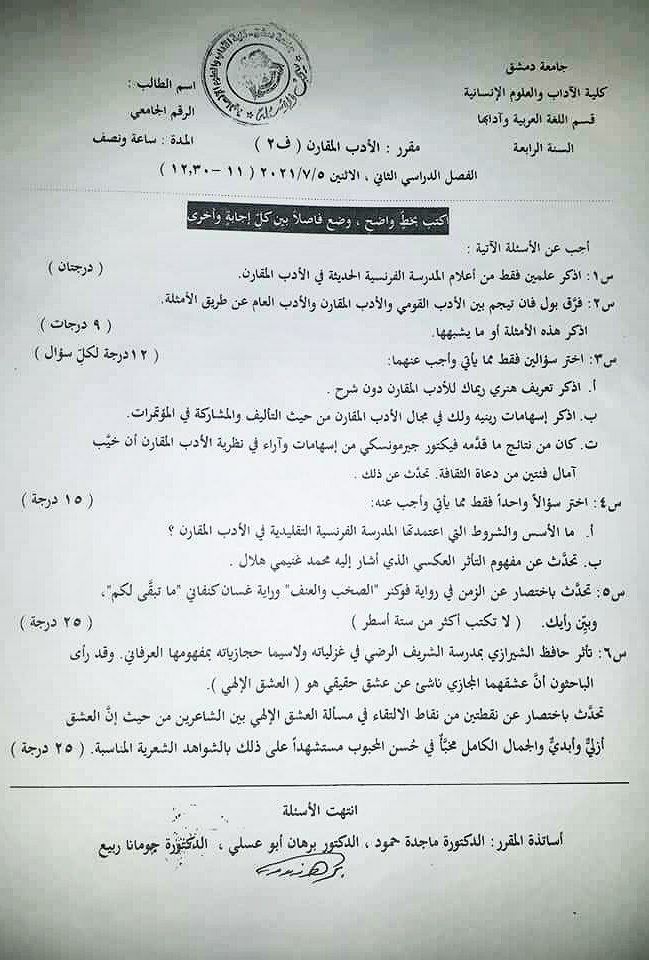 اسئلة اختبار في مادة الادب المقارن للسنة4 فصل2 عام 2021 جامعة دمشق كلية الاداب قسم لغة عربية