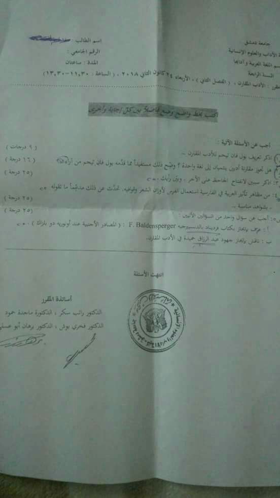 اسئلة اختبار في مادة الادب المقارن للسنة4 فصل2 عام 2018 جامعة دمشق كلية الاداب قسم لغة عربية