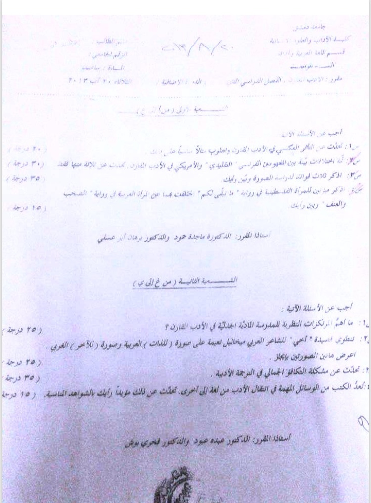اسئلة اختبار (مذاكرة) في مادة الادب المقارن للسنة4 فصل3 عام2013 جامعة دمشق كلية الاداب قسم لغة عربية