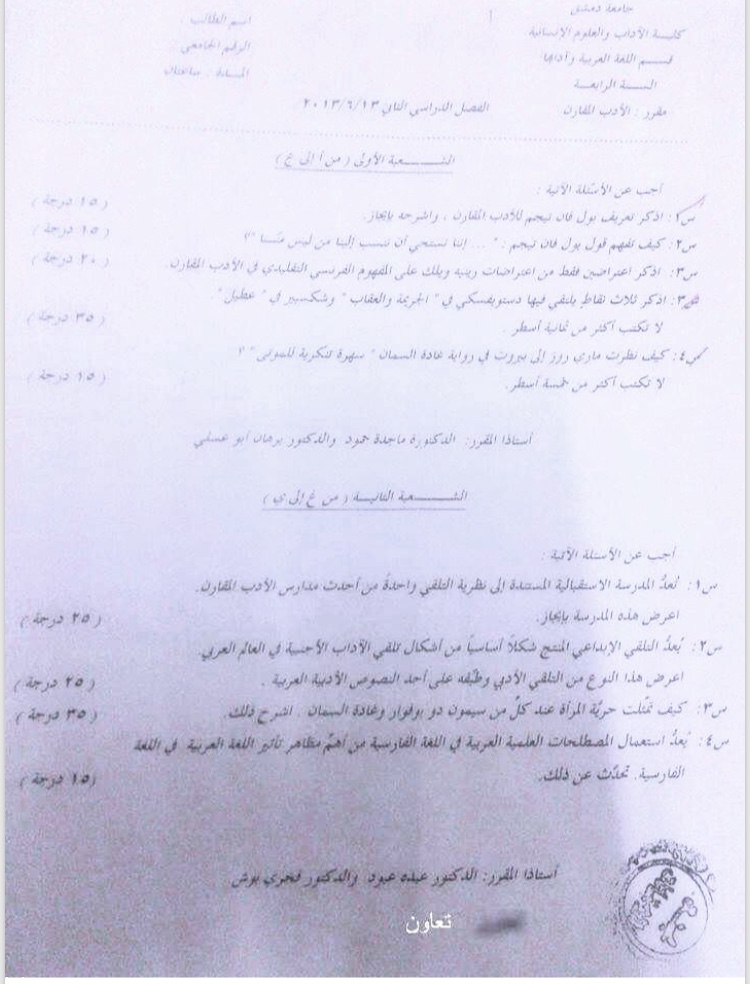 اسئلة اختبار (مذاكرة) في مادة الادب المقارن للسنة4 فصل3 عام2013 جامعة دمشق كلية الاداب قسم لغة عربية