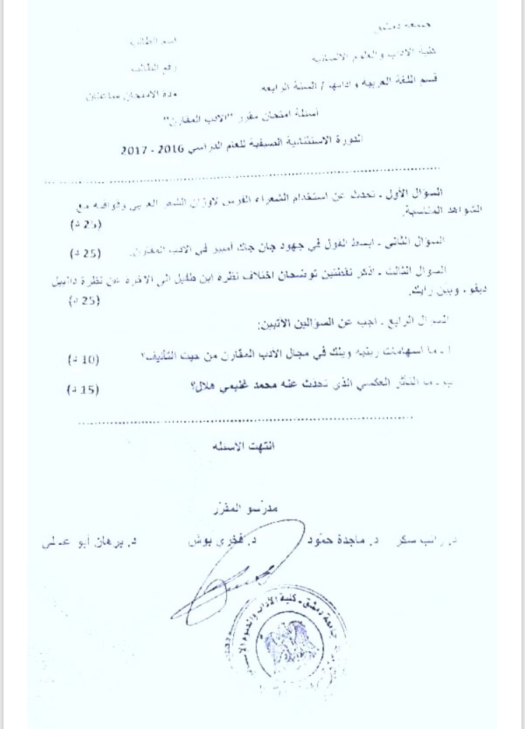 اسئلة اختبار (مذاكرة) في مادة الادب المقارن للسنة4 دورة صيفية عام 2016-2017 جامعة دمشق كلية الاداب قسم لغة عربية