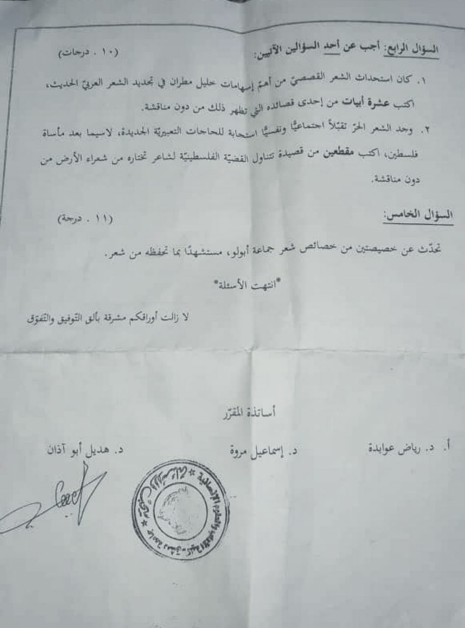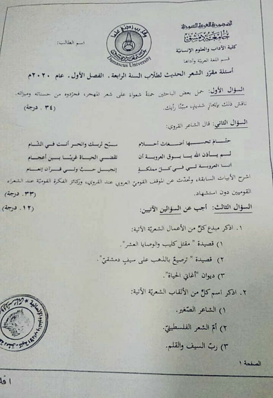اسئلة اختبار في مادة الشعر الحديث والمعاصر للسنة4 فصل1 عام2020 جامعة دمشق كلية الاداب قسم لغة عربية
