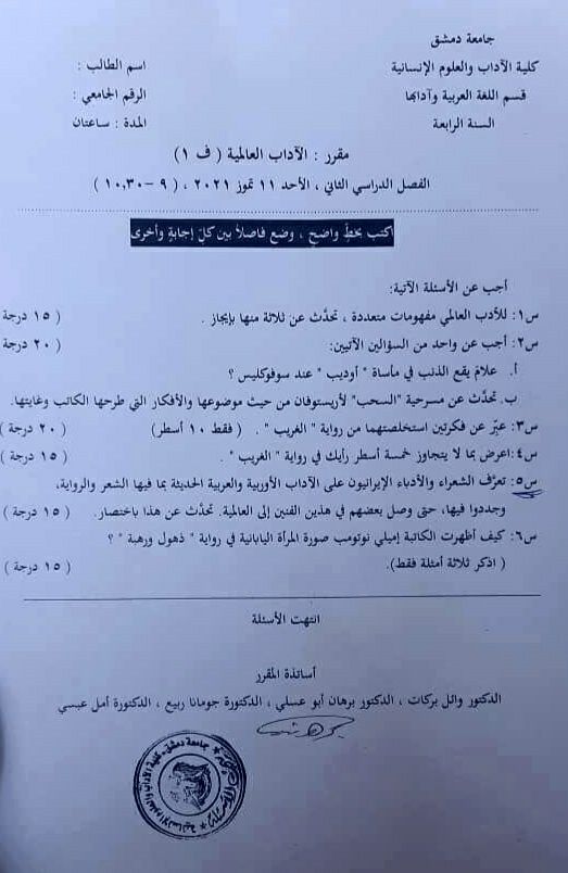 اسئلة اختبار في مادة الاداب العالمية للسنة4 فصل2 عام 2021 جامعة دمشق كلية الاداب قسم لغة عربية