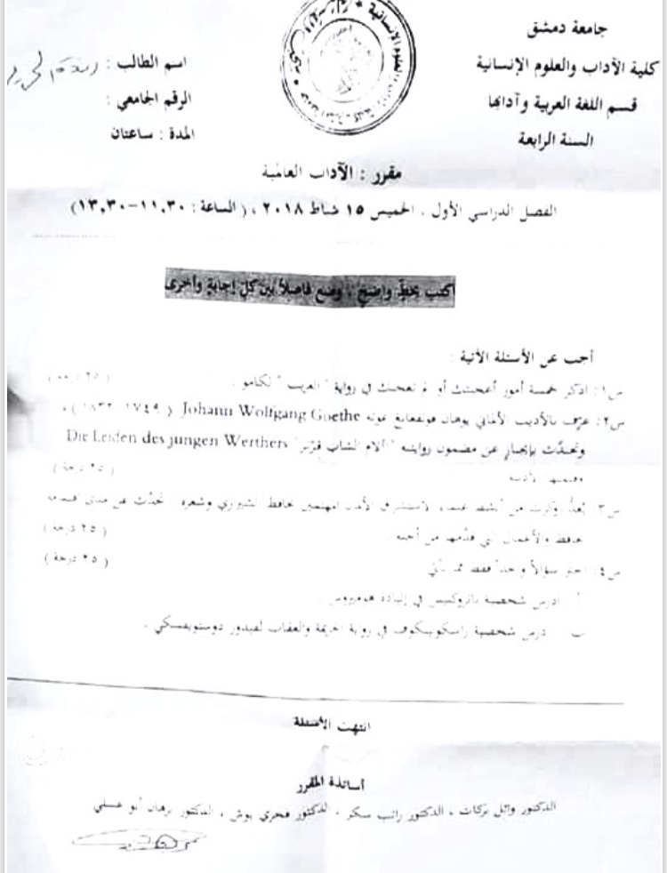اسئلة اختبار في مادة الاداب العالمية للسنة4 فصل1 عام 2018 جامعة دمشق كلية الاداب قسم لغة عربية