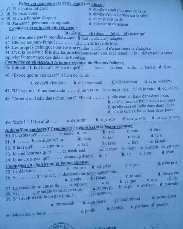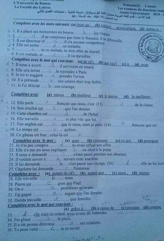 اسئلة اختبار في مادة اللغة الفرنسية للسنة2 فصل2 عام2019-2020جامعة دمشق كلية الاداب قسم لغة عربية