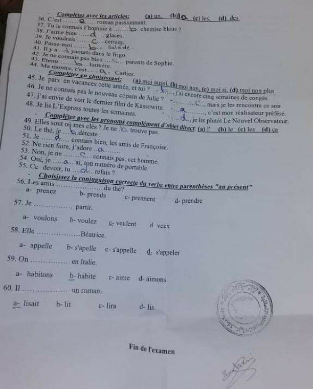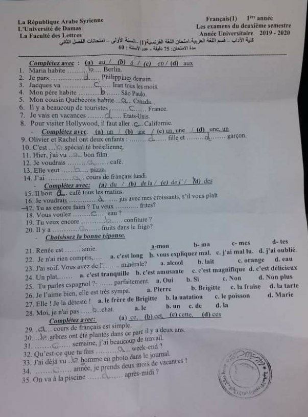 اسئلة اختبار في مادة اللغة الفرنسية للسنة1 فصل2 عام2019-2020جامعة دمشق كلية الاداب قسم لغة عربية