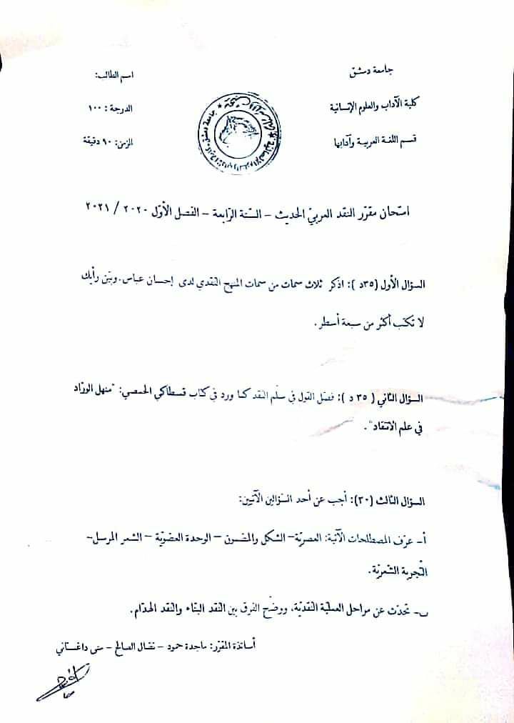 اسئلة اختبار في مادة النقد الحديث للسنة4 فصل1 عام 2020-2021 جامعة دمشق كلية الاداب قسم لغة عربية