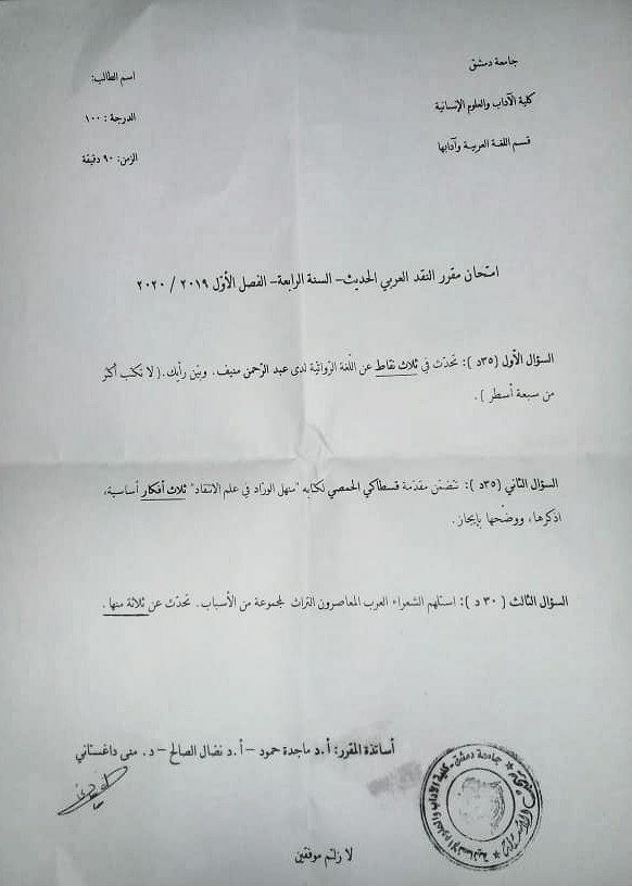 اسئلة اختبار في مادة النقد الحديث للسنة4 فصل1 عام 2020-2019 جامعة دمشق كلية الاداب قسم لغة عربية
