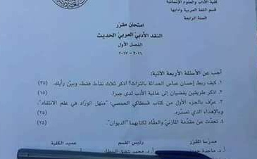 اسئلة اختبار في مادة النقد الحديث للسنة4 فصل1 عام 2017-2016 جامعة دمشق كلية الاداب قسم لغة عربية