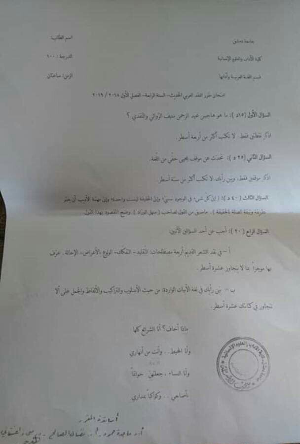 اسئلة اختبار في مادة النقد الحديث للسنة4 فصل1 عام 2019-2018 جامعة دمشق كلية الاداب قسم لغة عربية