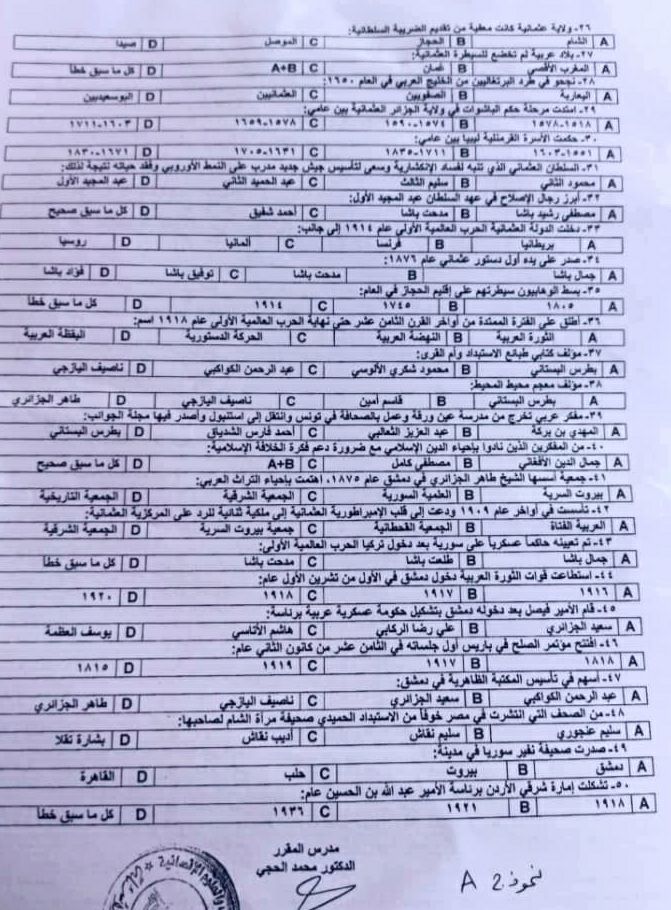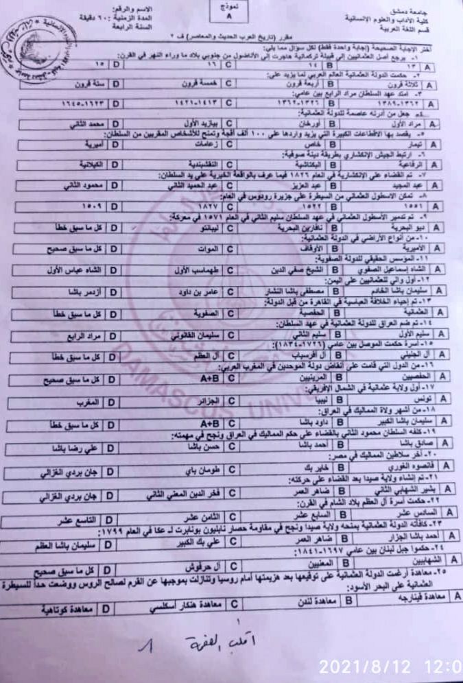 اسئلة اختبار في مادة تاريخ العرب الحديث والمعاصر للسنة4 فصل2 عام2021 نموذجA جامعة دمشق كلية الاداب قسم لغة عربية