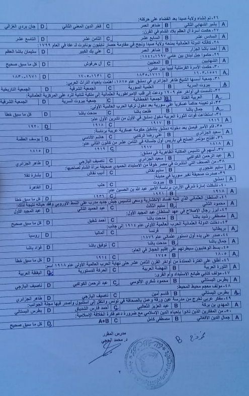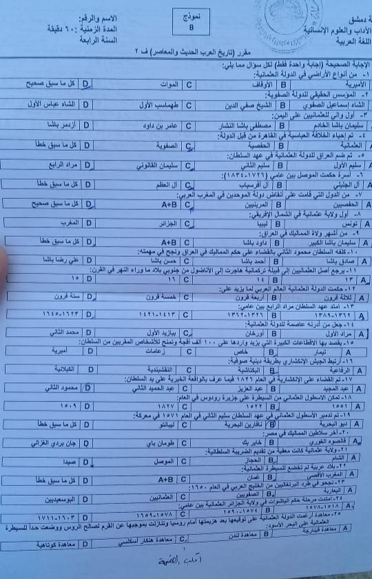 اسئلة اختبار في مادة تاريخ العرب الحديث والمعاصر للسنة4 فصل2 عام2021 نموذجB جامعة دمشق كلية الاداب قسم لغة عربية