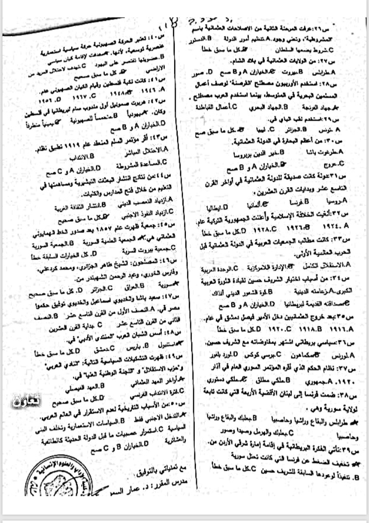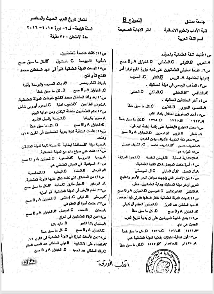 اسئلة اختبار في مادة تاريخ العرب الحديث والمعاصر للسنة4 فصل2 عام2015-2016 جامعة دمشق كلية الاداب قسم لغة عربية