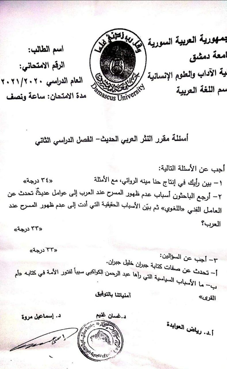 اسئلة اختبار في مادة النثر العربي الحديث للسنة4 فصل2 عام 2021-2020جامعة دمشق كلية الاداب قسم لغة عربية