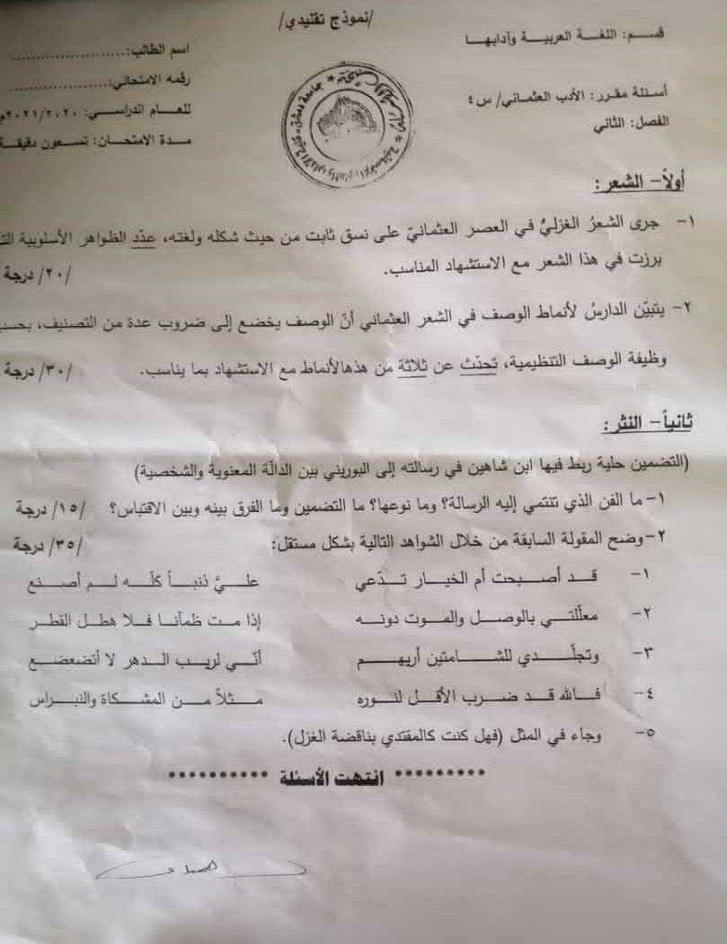 اسئة اختبار في مادة الادب العثماني للسنة4 ف2 عام2020-2021 جامعة دمشق كلية الاداب قسم لغة عربية