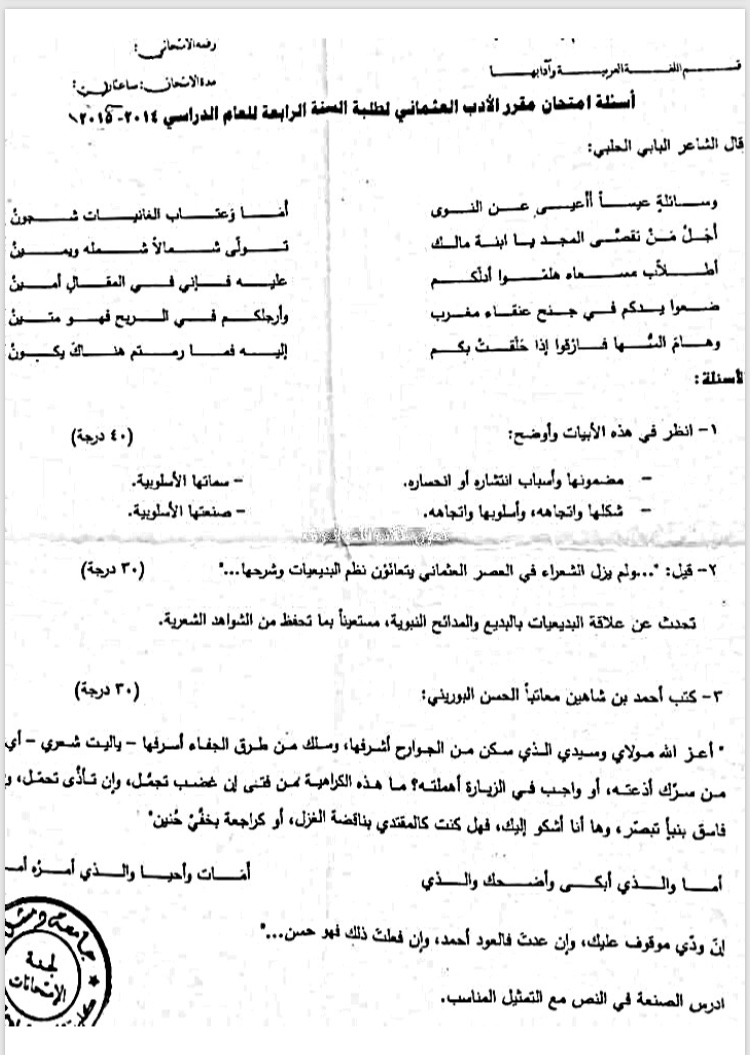 اسئة اختبار في مادة الادب العثماني للسنة4 ف2 عام2015-2014 جامعة دمشق كلية الاداب قسم لغة عربية