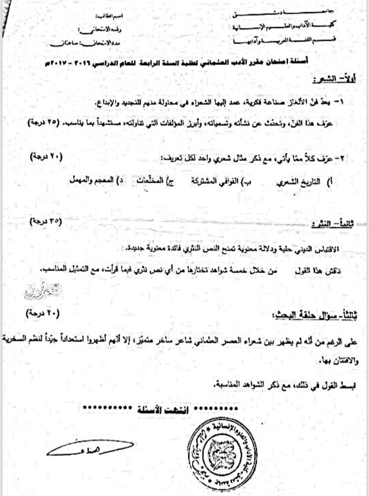 اسئة اختبار في مادة الادب العثماني للسنة4 ف1 عام2017-2016 جامعة دمشق كلية الاداب قسم لغة عربية