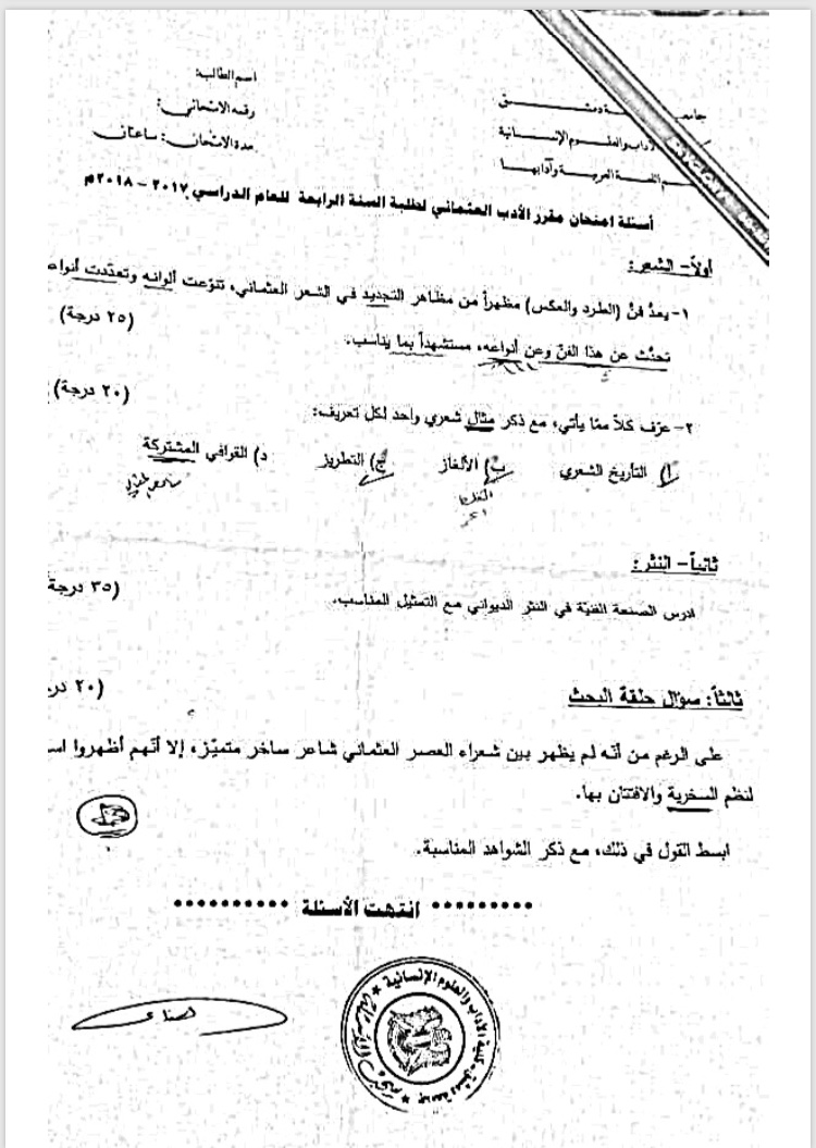 اسئة اختبار في مادة الادب العثماني للسنة4 ف1 عام2017-2018 جامعة دمشق كلية الاداب قسم لغة عربية