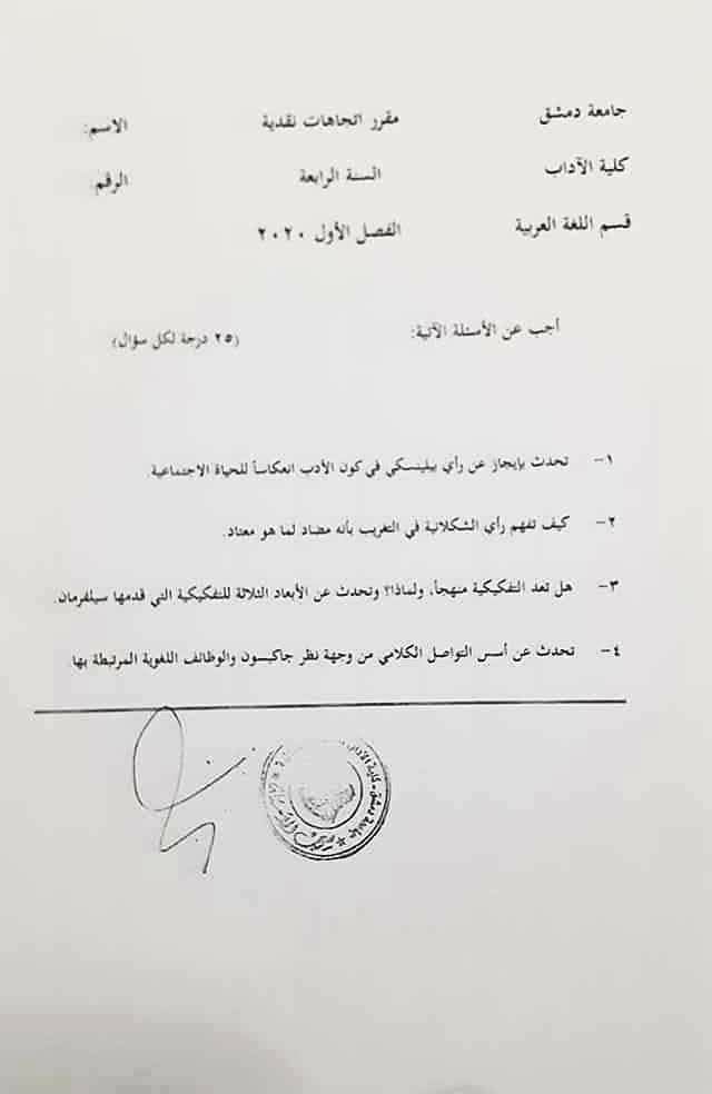 اسئلة اختبار في مادة الاتجاهات النقدية للسنة4 فصل1 عام2020 جامعة دمشق كلية الاداب قسم لغة عربية