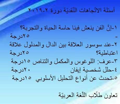 اسئلة اختبار في مادة الاتجاهات النقدية للسنة4 فصل2 عام2019 جامعة دمشق كلية الاداب قسم لغة عربية
