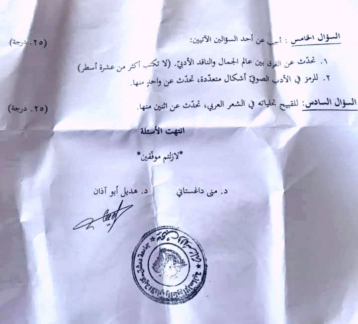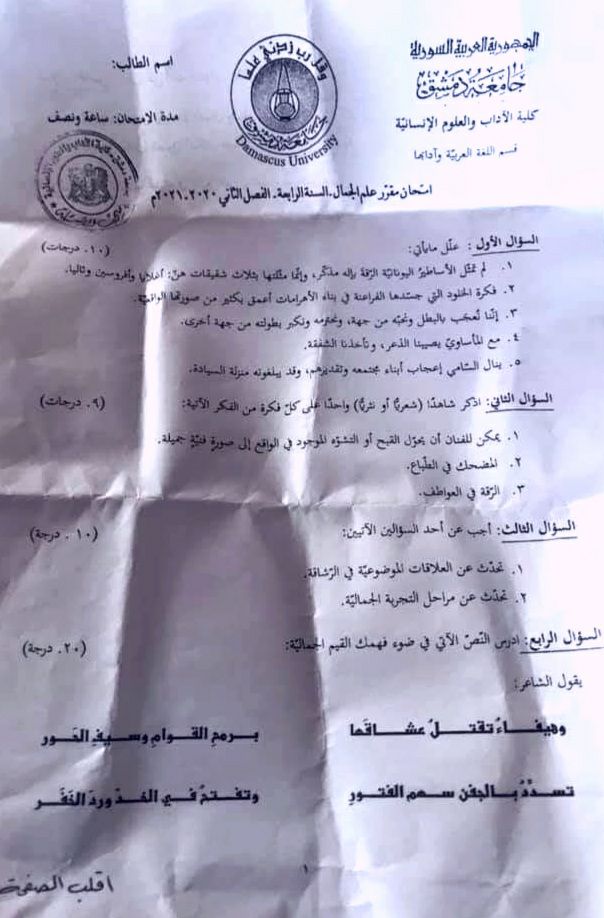 اسئلة اختبار في مادة علم الجمال للسنة4 فصل2 عام 2020-2021 جامعة دمشق كلية الاداب قسم لغة عربية