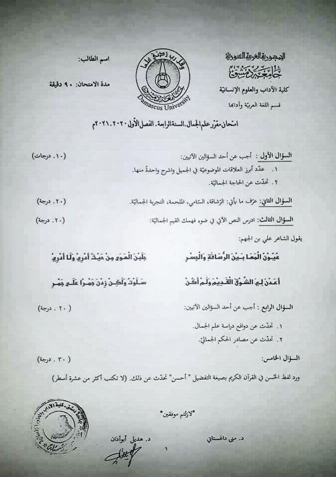 اسئلة اختبار في مادة علم الجمال للسنة4 فصل1 عام 2020-2021 جامعة دمشق كلية الاداب قسم لغة عربية