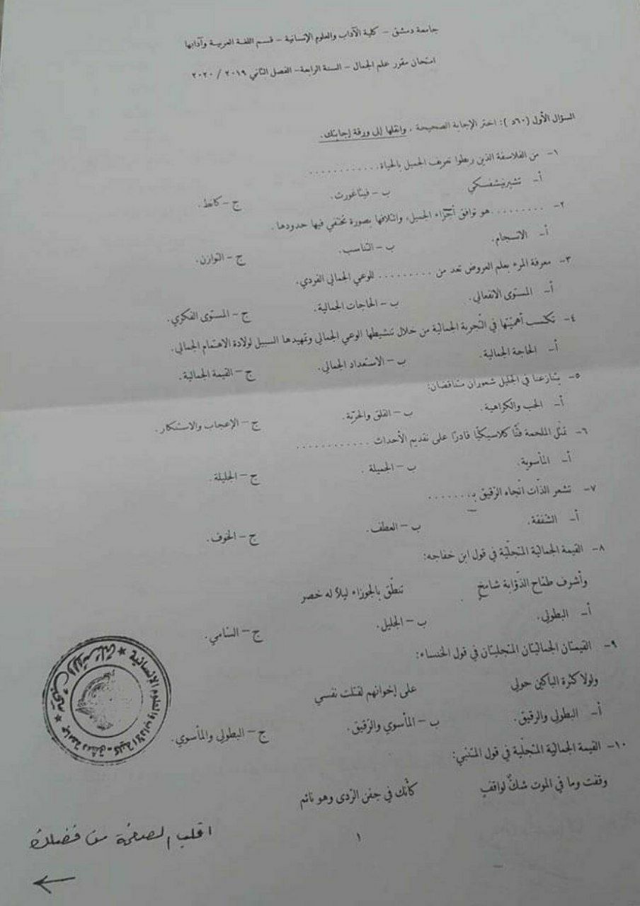 اسئلة اختبار في مادة علم الجمال للسنة4 فصل2 عام 2020-2019 جامعة دمشق كلية الاداب قسم لغة عربية