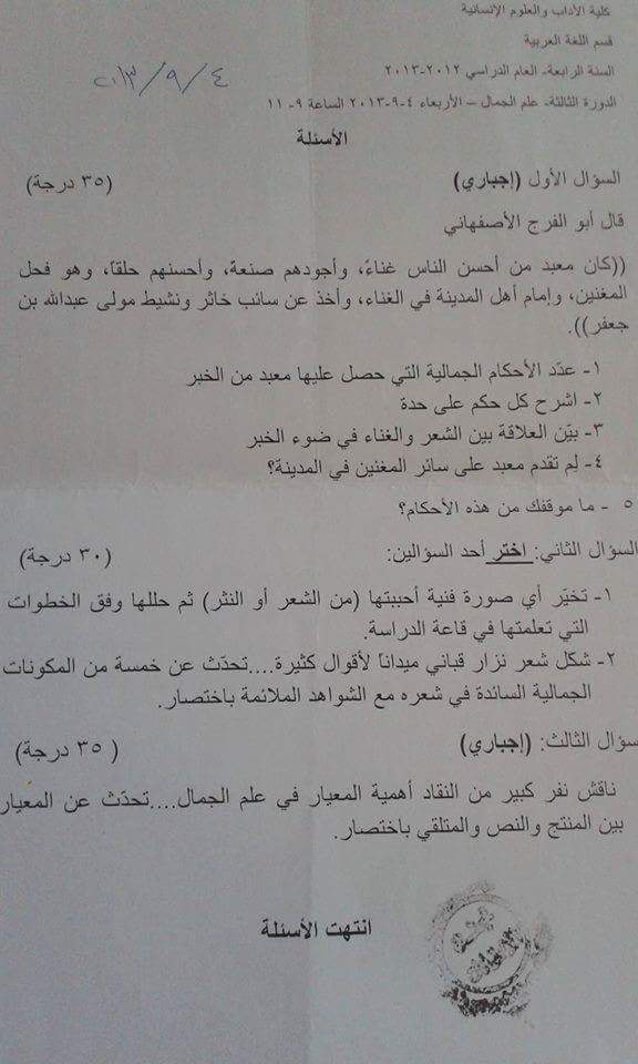 اسئلة اختبار في مادة علم الجمال للسنة4 فصل3 عام2013 جامعة دمشق كلية الاداب قسم لغة عربية