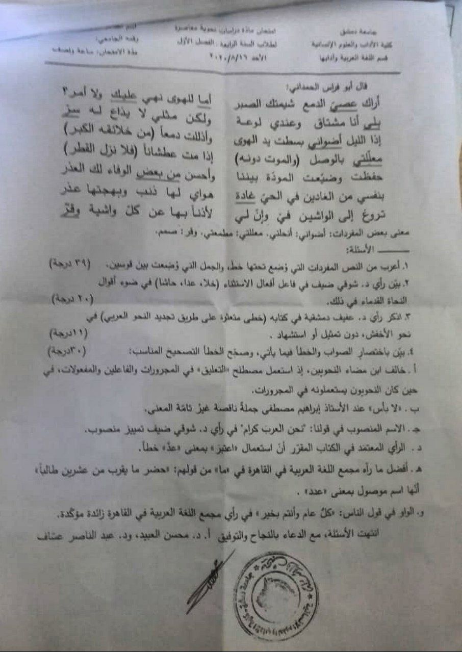 اسئلة اختبار في مادة الدراسات النحوية المعاصرة للسنة4 فصل2 عام 2020جامعة دمشق كلية الاداب قسم لغة عربية