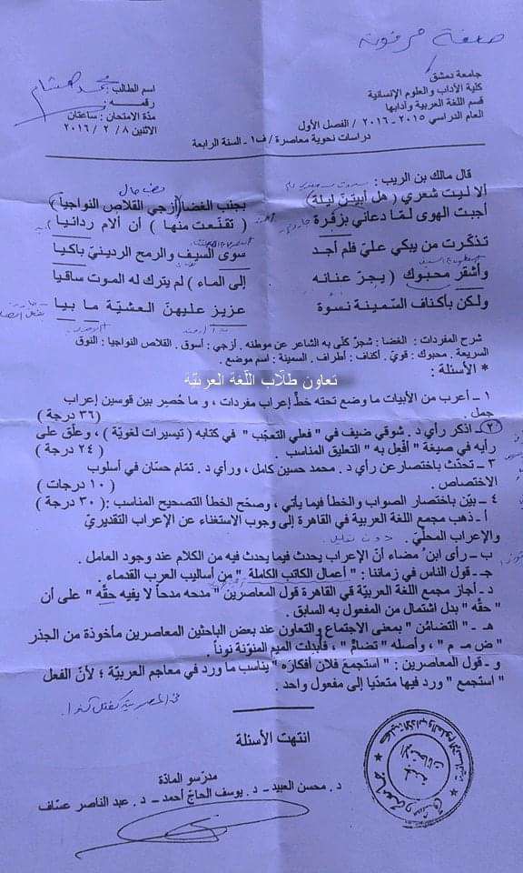 اسئلة اختبار في مادة الدراسات النحوية المعاصرة للسنة4 فصل1 عام 2015-2016 جامعة دمشق كلية الاداب قسم لغة عربية