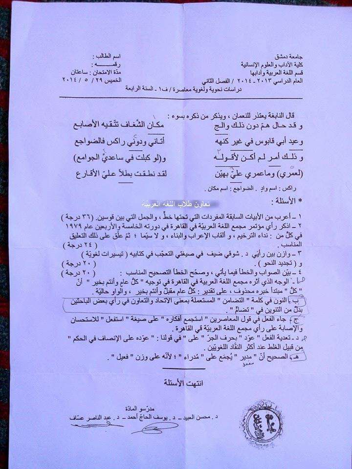 اسئلة اختبار في مادة الدراسات النحوية للسنة4 فصل2 عام 2014-2013 جامعة دمشق كلية الاداب قسم لغة عربية