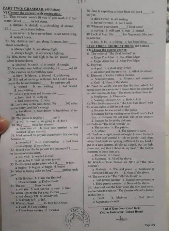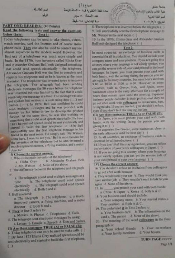 اسئلة اختبار في مادة اللغة الانجليزية للسنة4 فصل1 عام2021 جامعة دمشق كلية الاداب قسم لغة عربية