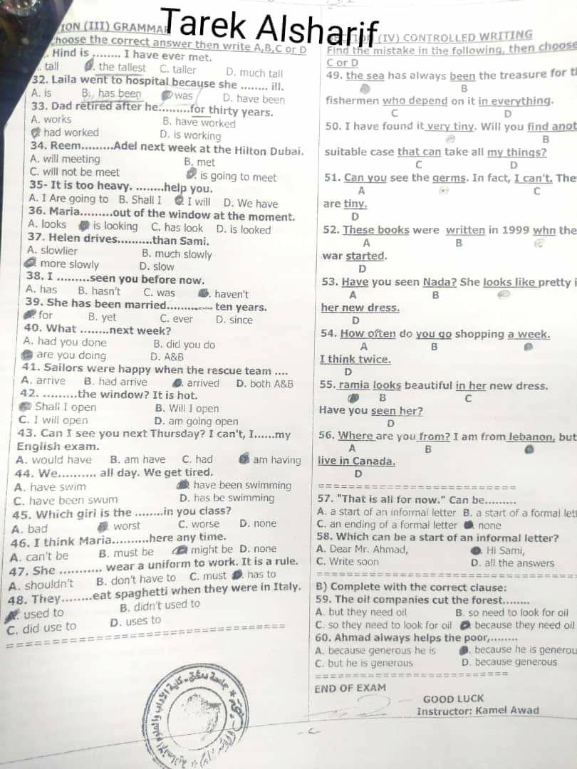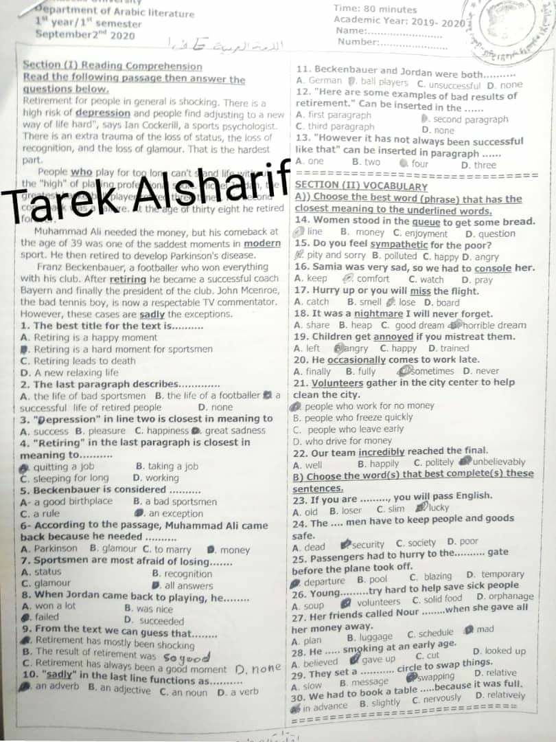 اسئلة اختبار في مادة اللغة الانجليزية للسنة1 فصل2 عام2019-2020 جامعة دمشق كلية الاداب قسم لغة عربية