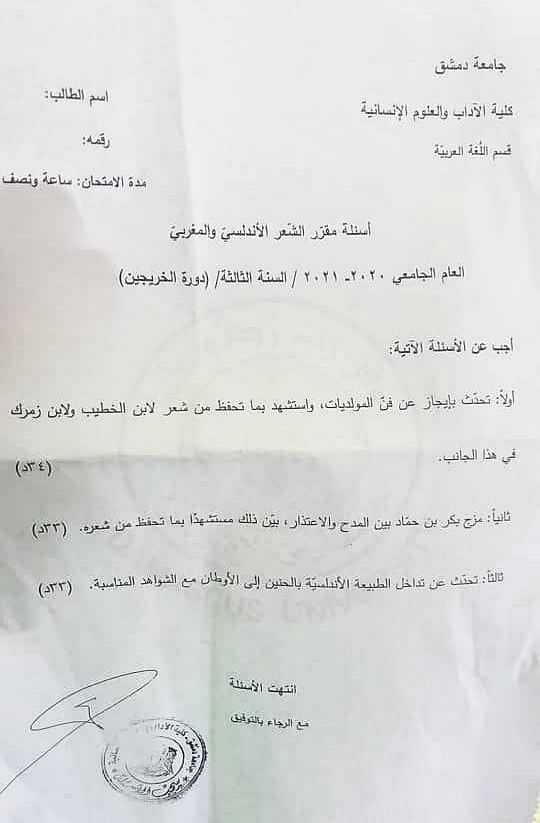 اسئلة اختبار في مادة الشعر الاندلسي للسنة3 فصل3 عام 2021-2020 جامعة دمشق كلية الاداب قسم لغة عربية