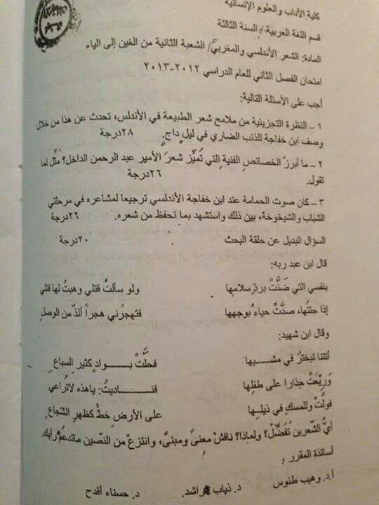اسئلة اختبار في مادة الشعر الاندلسي للسنة3 فصل2 عام 2013-2012 (شعبة2) جامعة دمشق كلية الاداب قسم لغة عربية