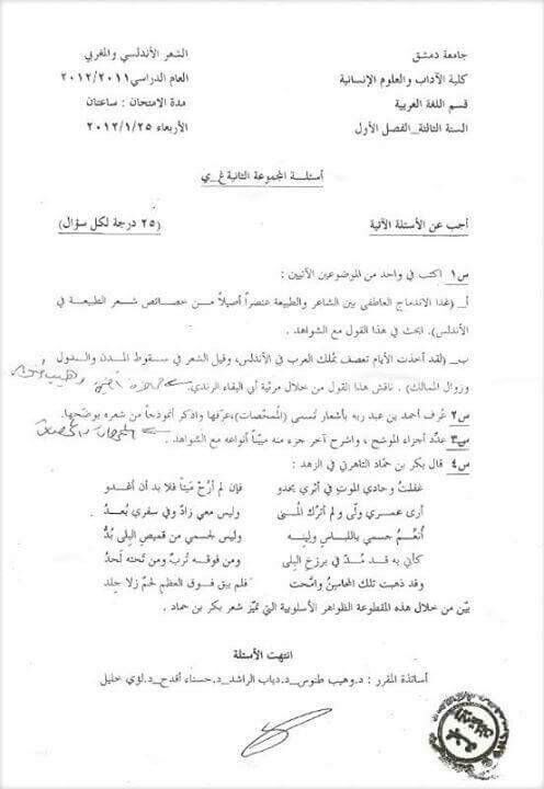 اسئلة اختبار في مادة الشعر الاندلسي للسنة3 فصل1 عام 2011-2012 جامعة دمشق كلية الاداب قسم لغة عربية