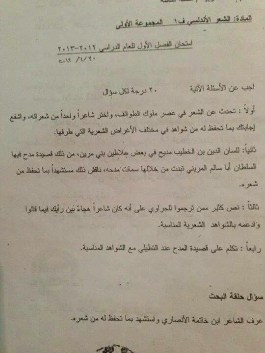 اسئلة اختبار في مادة الشعر الاندلسي للسنة3 فصل1 عام 2012-2013 (مجموعة1) جامعة دمشق كلية الاداب قسم لغة عربية