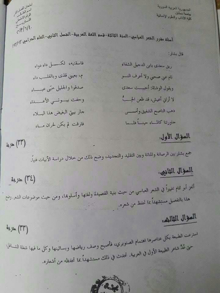اسئلة اختبار في مادة الشعر العباسي للسنة3 فصل2 عام2013-2012 جامعة دمشق كلية الاداب قسم لغة عربية