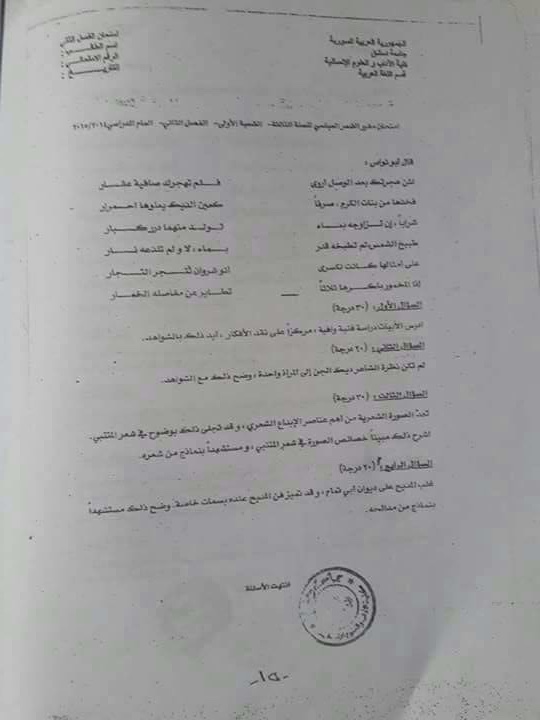اسئلة اختبار في مادة الشعر العباسي للسنة3 فصل2 عام2010-2011 جامعة دمشق كلية الاداب قسم لغة عربية