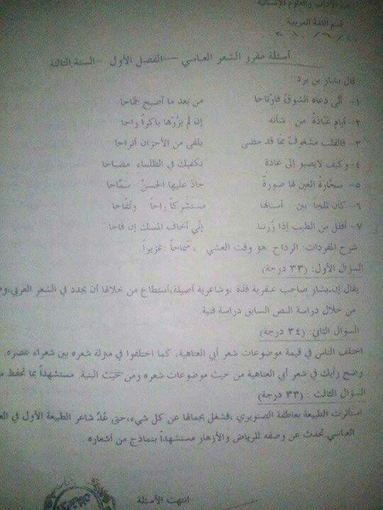 اسئلة اختبار في مادة الشعر العباسي للسنة3 فصل1 عام 2010 جامعة دمشق كلية الاداب قسم لغة عربية