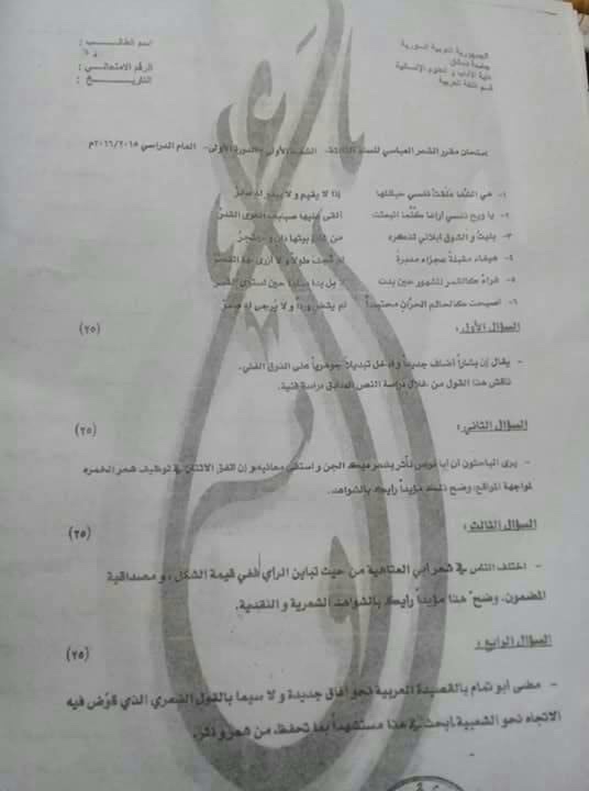 اسئلة اختبار في مادة الشعر العباسي للسنة3 فصل1 عام 2015-2016 (شعبة1) جامعة دمشق كلية الاداب قسم لغة عربية
