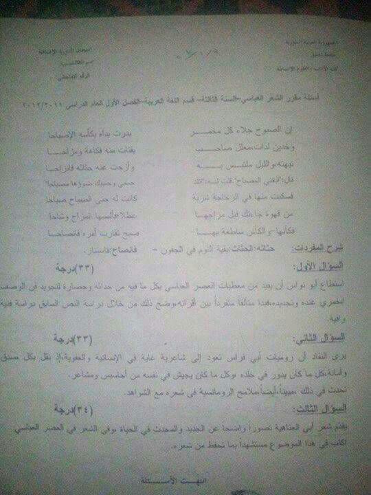 اسئلة اختبار في مادة الشعر العباسي للسنة3 فصل1 عام 2012-2011 جامعة دمشق كلية الاداب قسم لغة عربية