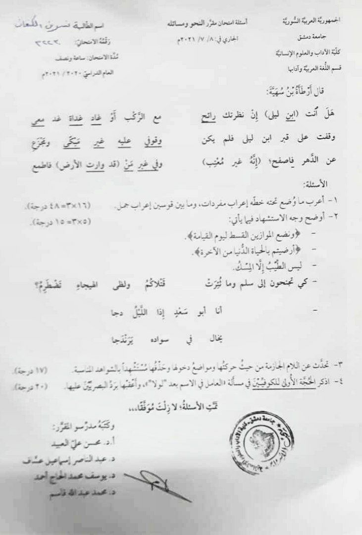 اسئلة اختبار في مادة النحو ومسائله للسنة3 فصل2 عام2021-2020 جامعة دمشق كلية الاداب قسم لغة عربية