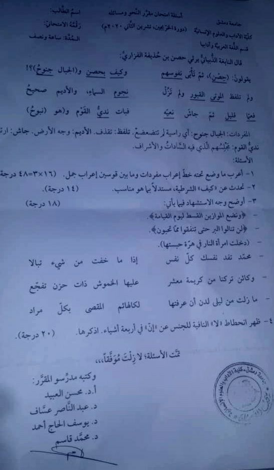 اسئلة اختبار في مادة النحو ومسائله للسنة3 فصل3 (خريجين) عام2020 جامعة دمشق كلية الاداب قسم لغة عربية