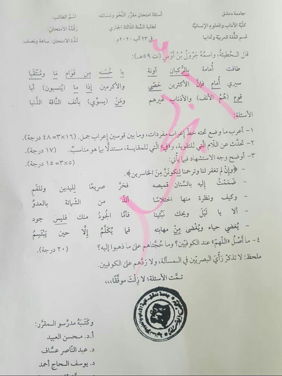 اسئلة اختبار في مادة النحو ومسائله للسنة3 فصل2 عام2020 جامعة دمشق كلية الاداب قسم لغة عربية